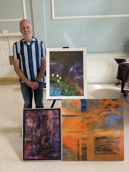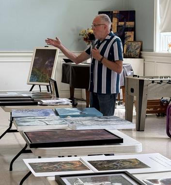 There was a last-minute change for our planned speaker in September, due to illness. Doug Steere gave a presentation on 24-hour notice, and you might have noticed he was not Regina Willard (who was originally scheduled). Nonetheless, maybe you heard a little about essential tremors and colorblindness, both of which affect the way that Doug paints. Doug doesn't use traditional brushes very often because of how his hands shake, and he gravitates to bold and bright colors which he doesn't see the same as people without color vision deficiency. He said, "It's not an excuse, it's just why I do what I do the way I do."